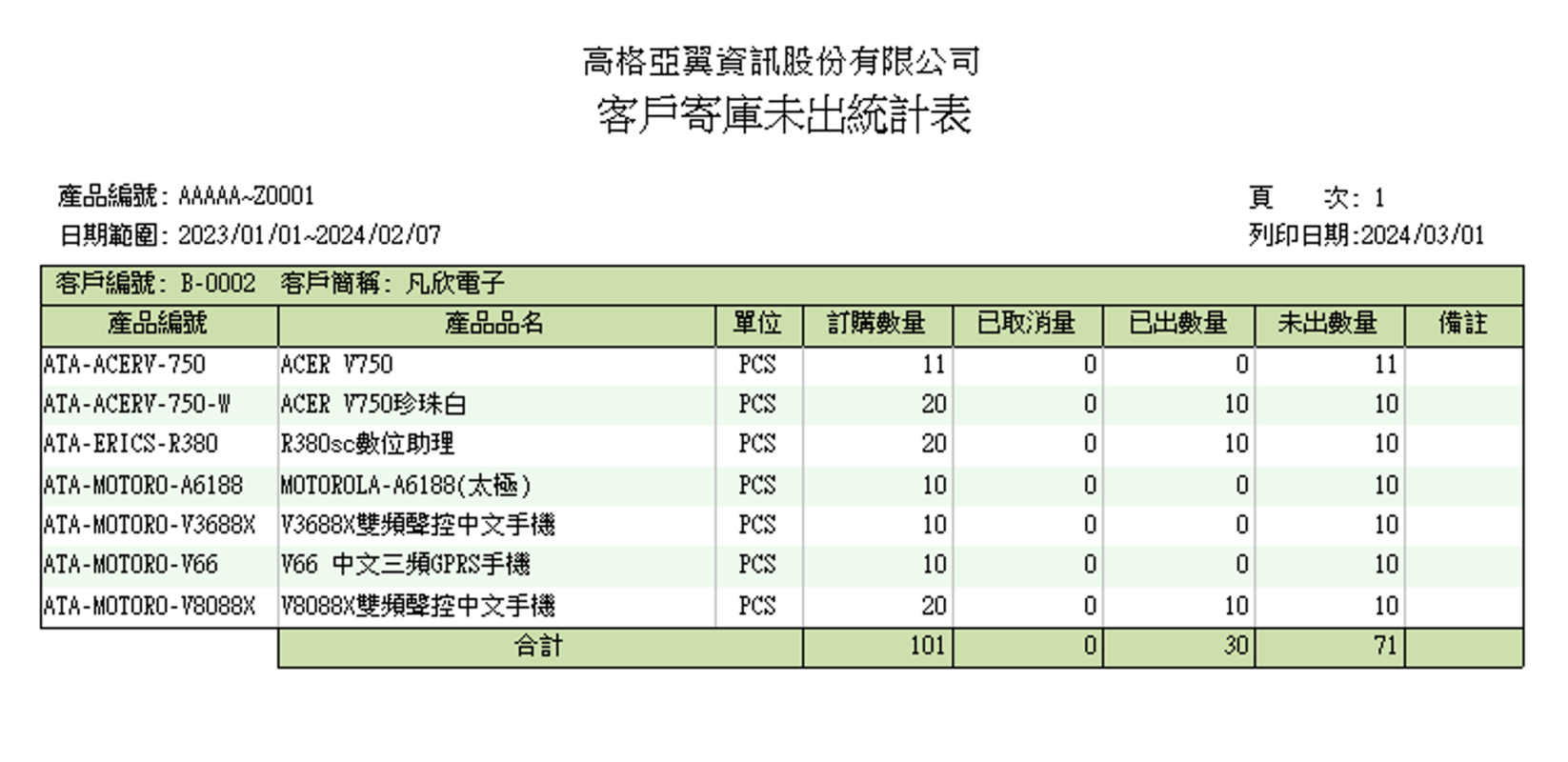 佷多買賣業在選購進銷存軟體時,由於行業特性,必需考慮進銷存要能管理產品的寄賣或寄庫,例如:油品業、食品業或精品包包買賣等,高格Pilot進銷存軟體可以作好這方面的管理,讓管理者事半功倍,讓軟體使用者節省寶貴時間,不必再用excel表格抄抄寫寫,不必再用手工統計銷售及營運數據,以下報表範例提供進銷存軟體中採訂模組,可自動產生客戶在公司尚有多少寄庫量統計表: