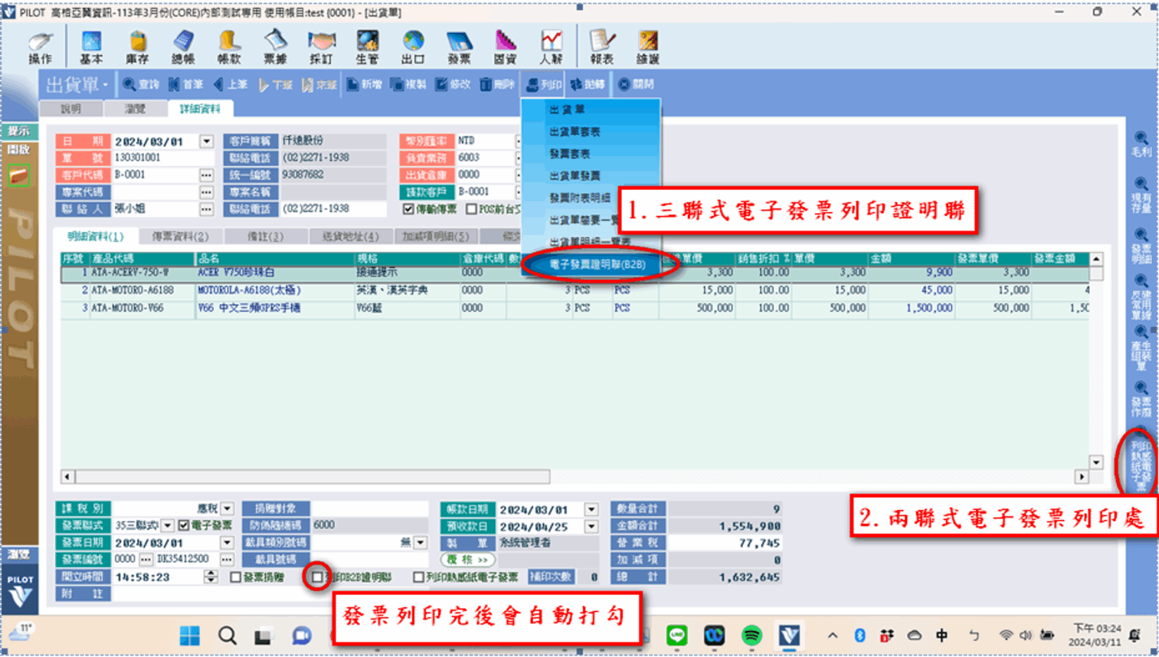 近日進銷存軟體的客戶,接連幾家都不約而同的問及進銷存軟體”電子發票”的使用需求,因為有的買賣業出貨量大,手開發票很費時,創馨資訊提供的高格PILOT進銷存軟體,可以在您列印出貨單的同時,馬上列印出”電子發票”,列印完後也會在下方勾選已列印B2B或B2C的電子發票,方便連同出貨單隨貨附發票,並同時在會計軟體中,產生會計傳票,損益表即刻自動產生,本公司進銷存軟體與會計軟體完美組合,特價優惠中!